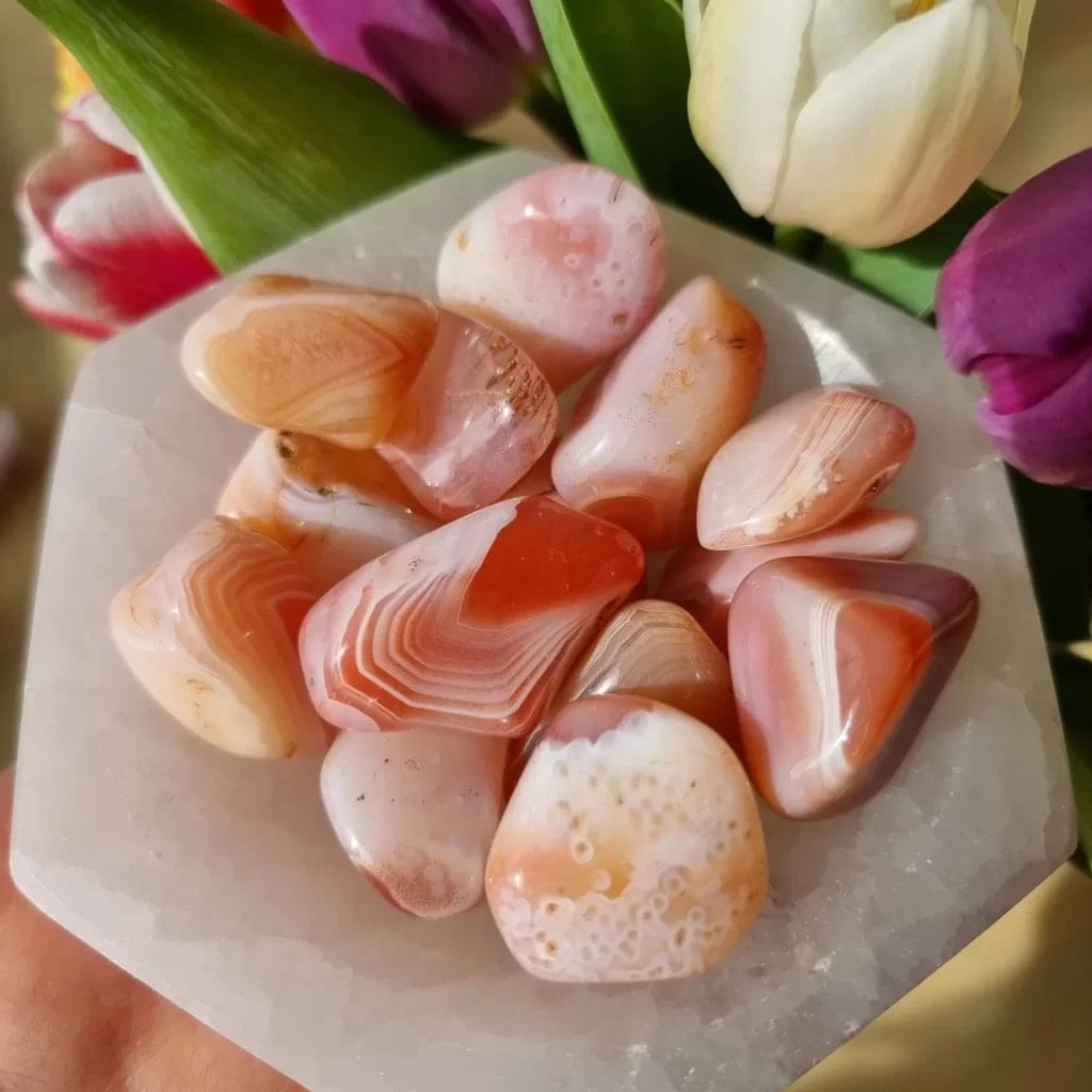 Apricot Agate is commonly used for emotional balance, promoting digestive health, and enhancing self-confidence. To benefit from its healing properties, you can carry it with you, meditate with it, wear it as jewelry, place it on specific body areas, or incorporate it into your environment as decorative pieces or crystal grids.