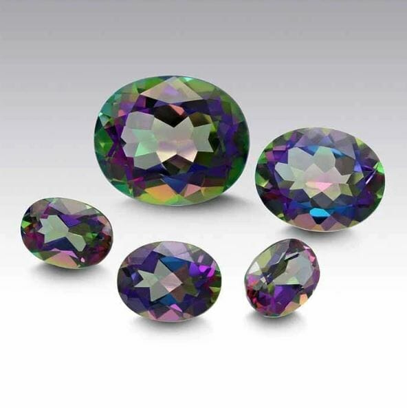 Other names for mystic topaz include Rainbow Topaz, Fire topaz, Alaskan Topaz and even Caribbean Topaz. These are all different names for the same stone, which is White Topaz which has been treated with titanium mist to give it an enduring rainbow of hues.